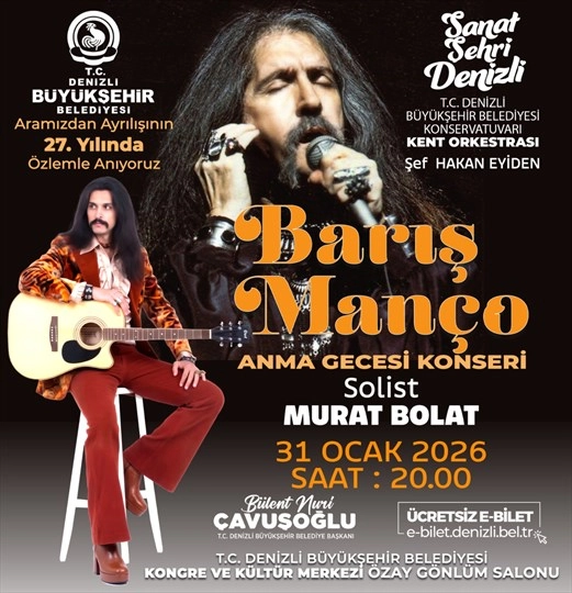 Denizli Büyükşehir Belediyesi, Barış Manço'yu aramızdan ayrılışının 27. yılında Kent Orkestrası ve solist Murat Bolat'ın sahne alacağı ücretsiz bir konserle anacak. Konser, 31 Ocak 2026'da Kongre ve Kültür Merkezi'nde gerçekleştir
