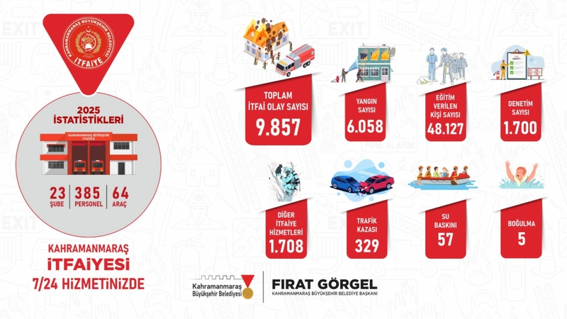 23 şube, 385 deneyimli personel ve 64 araçla yıl boyunca sahada aktif görev alan İtfaiye ve Afet İşleri Dairesi Başkanlığı, 2025 yılında; 6 bin 58 yangın, 329 trafik kazası, 57 su baskını, 5 boğulma ve 9 bin 857 itfai olay olmak üzere toplam 16 bin 306 olaya müdahale etti.