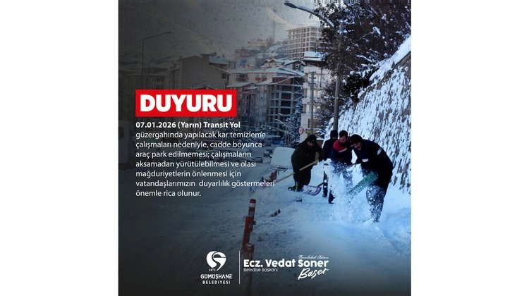 Gümüşhane Belediyesi, 6 Ocak 2026 Salı gününe ait bir duyuru yayımladı. Duyurunun içeriği kamuoyuyla paylaşıldı.