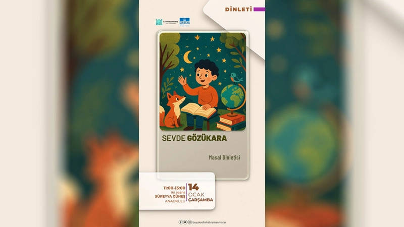Kahramanmaraş Büyükşehir Belediyesi, çocuk edebiyatı yazarı Sevde Gözükara'nın katılımıyla 14 Ocak Çarşamba günü anaokulunda masal dinletisi gerçekleştirecek. Etkinlik, çocukların hayal dünyasını zenginleştirmeyi ve kitaplara olan