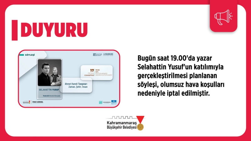 Kahramanmaraş Büyükşehir Belediyesi'nin Mevlâna İdris Kültür Sanat Sezonu kapsamında düzenleyeceği Selahattin Yusuf ve Mustafa Köneçoğlu'nun katılacağı söyleşi, olumsuz hava şartları nedeniyle gerçekleştirilemeyecek.