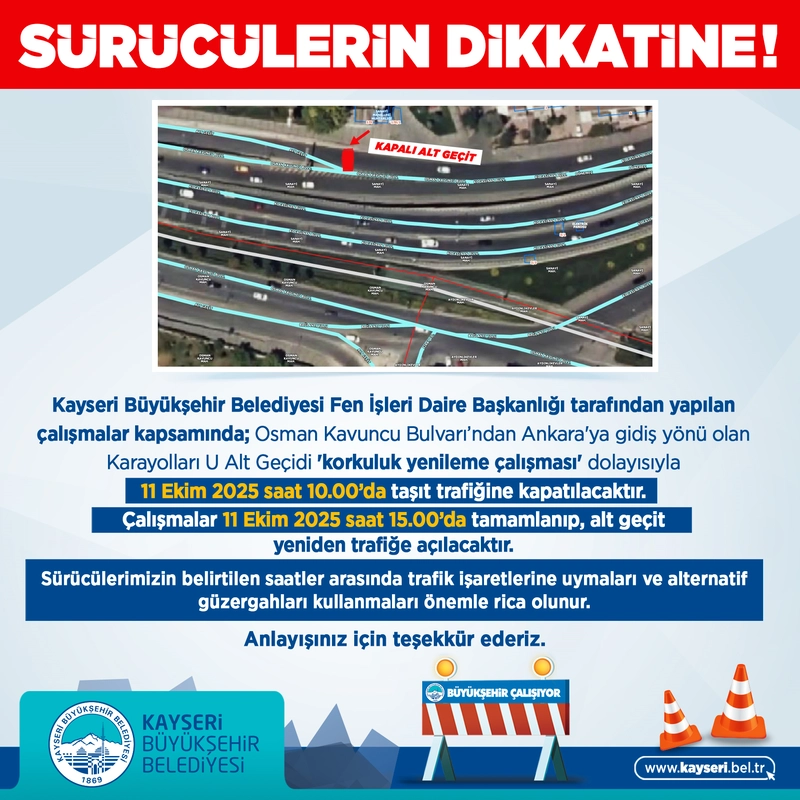 Osman Kavuncu Bulvarı'ndan Ankara'ya gidiş yönündeki Karayolları U Alt Geçit yolu, korkuluk yenileme çalışması nedeniyle 11 Ekim 2025 saat 10.00'da taşıt trafiğine kapatılacak.